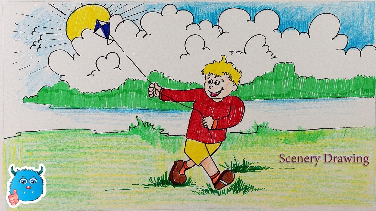 How To Draw A Boy Flying Kite Scene Step By Step Very Easy Youtube
