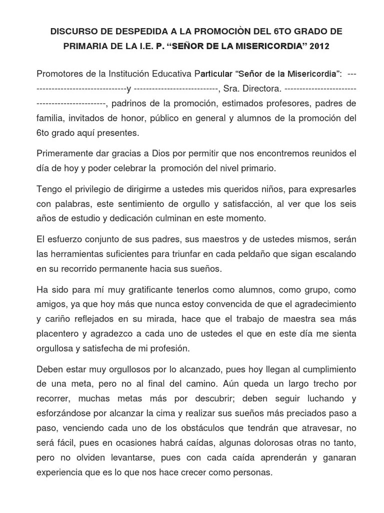 Discurso De Despedida A La Promocion Del 6to Grado De Primaria De La I